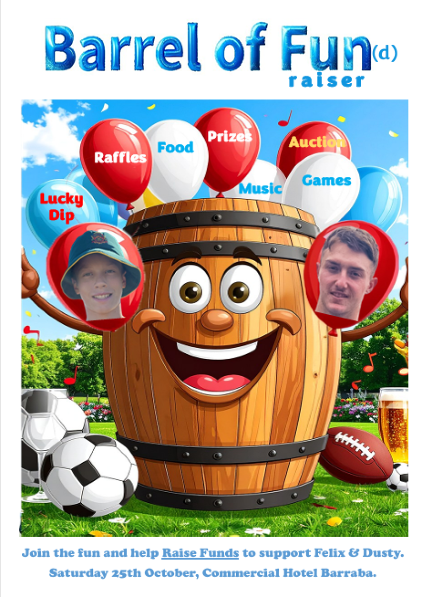 This Saturday, the 25th October, is the “Barrel of Fun” day fund raiser for two local boys, Felix Urquhart and Dusty Hiscock. Once again, Barraba has produced 2 bright and upcoming sport stars. The support from friends, family and the broader community will culminate in a day of fun being held at the Commercial Hotel from 11.00 am. The raffle prizes donated for the day include a range of beauty and shopping vouchers, camping gear and dinner vouchers.
