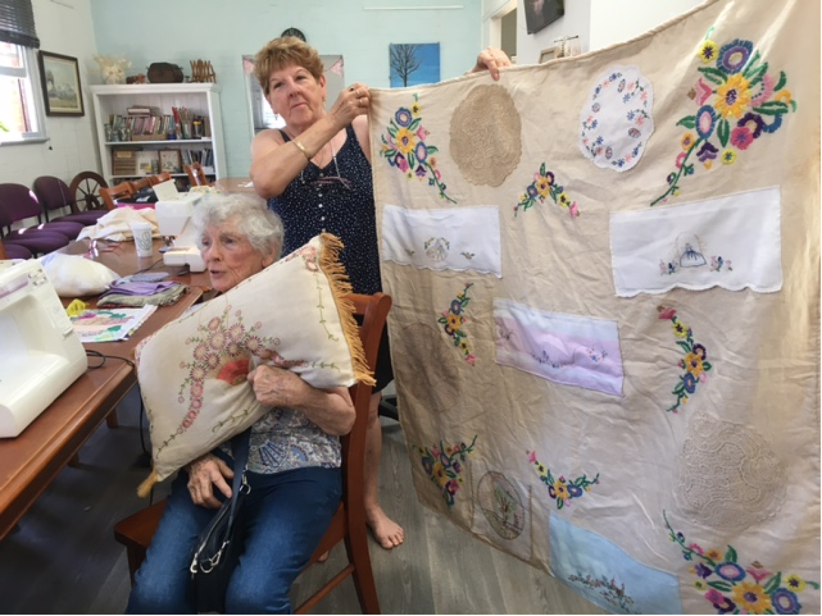 Sharon O’Dell and the Sunday Sewers got to work and transformed the individual items into a cushion and knee rug to go back to Margaret for use in her room at Richardson House. A wonderful gift of time by Sharon to ensure important and sentimental hand-made family treasures can continue to be enjoyed by Margaret.