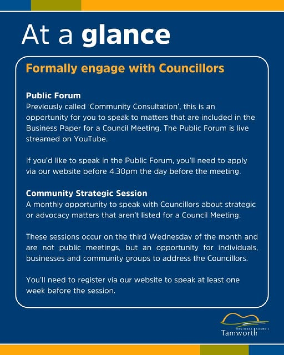 You can register and find out more about these opportunities to engage with Councillors at our website - https://www.tamworth.nsw.gov.au/.../mayor-and-councillors